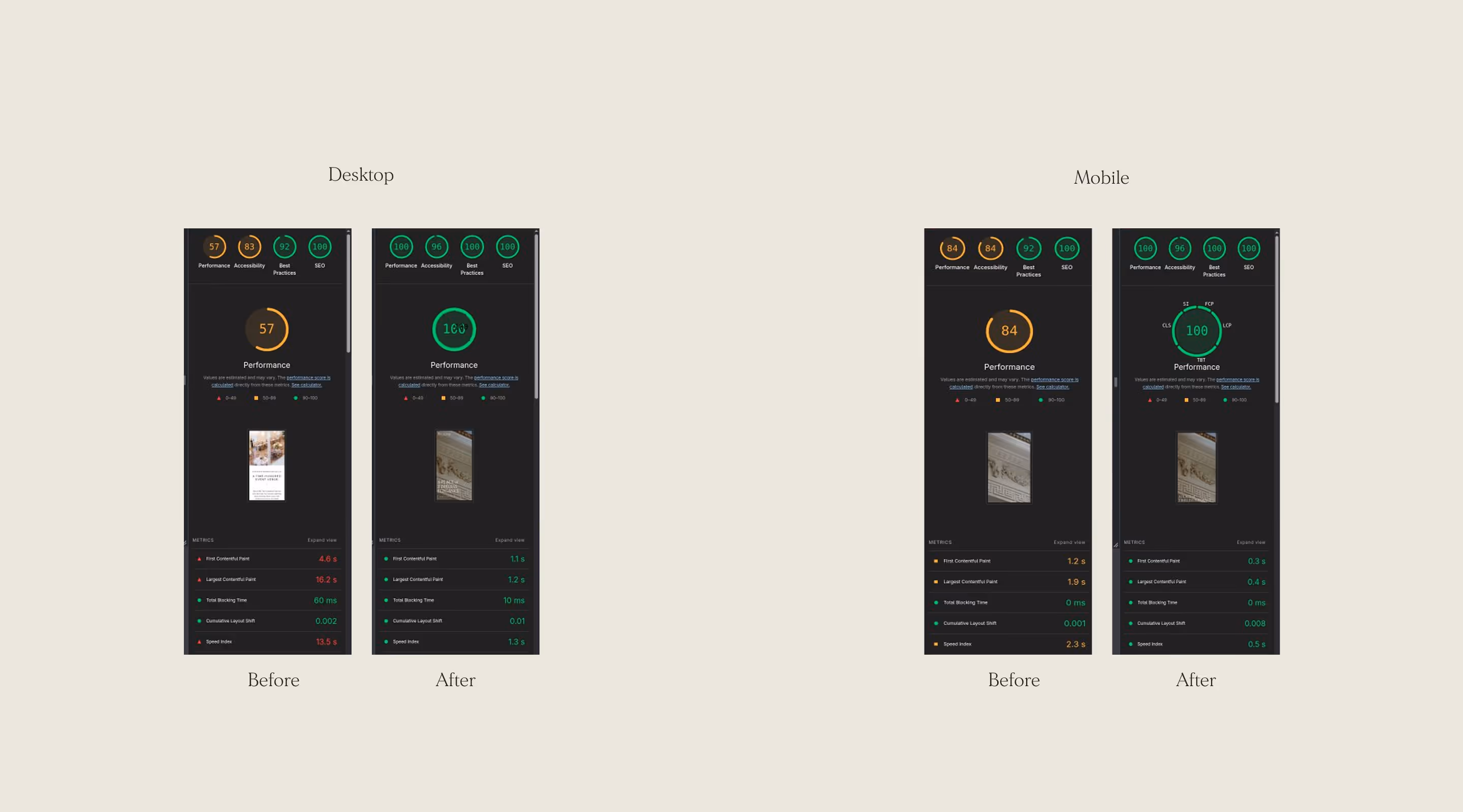 The new website significantly improved performance and technical optimization, resulting in faster load times and stronger Lighthouse scores across both desktop and mobile.