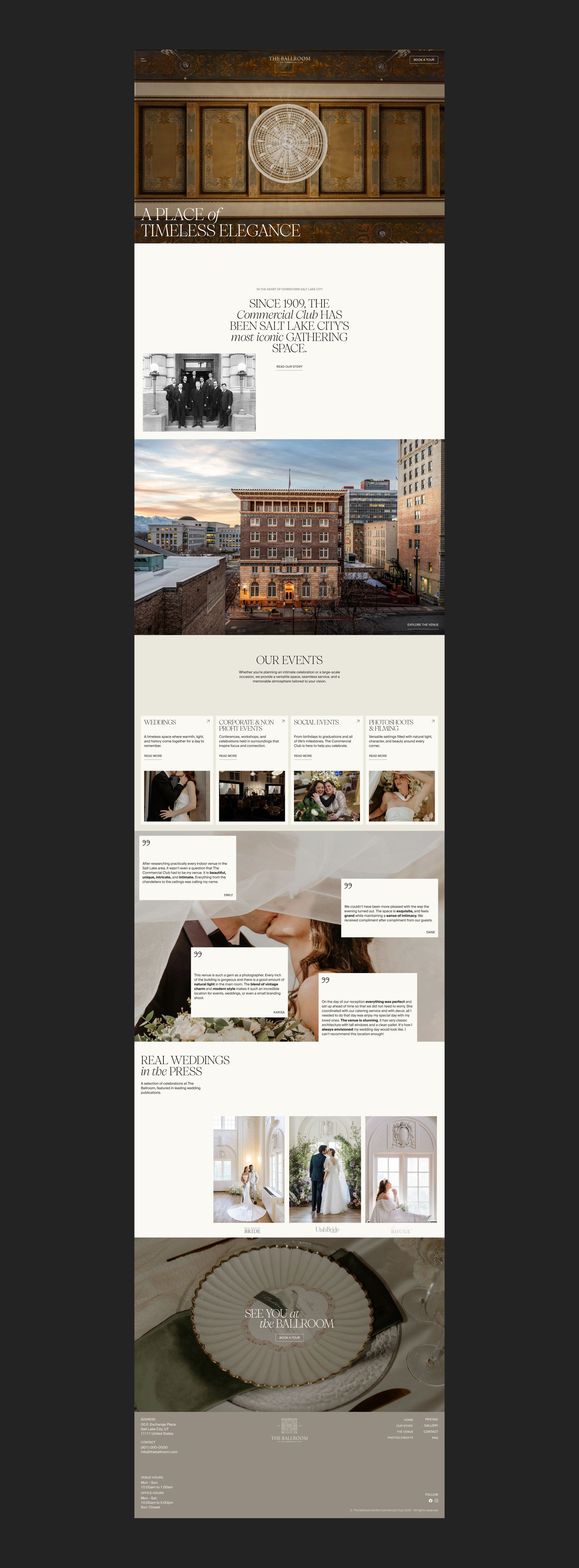 The Ballroom at The Commercial Club is a landmark event space in downtown Salt Lake City. While the venue had already built a strong reputation locally, its existing brand identity and website no longer reflected the elegance, and heritage of the space. As the venue prepared to grow its event business and attract a broader audience, a more refined and cohesive brand presence was needed.